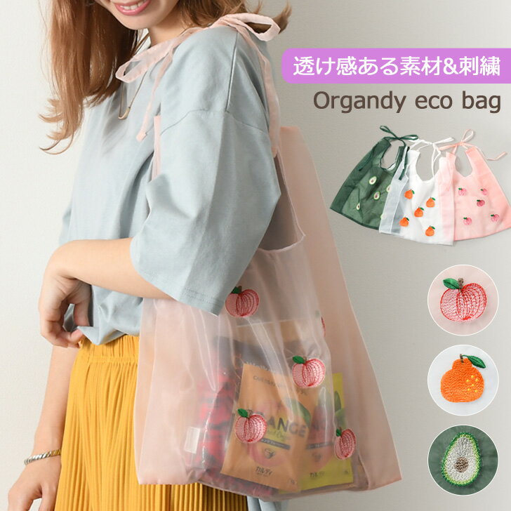 刺繍 フルーツ エコバッグ バッグ エコバック コンビニ レジ袋 小さめ チュールバッグ シアーバッグ マイバッグ オーガンジー シースルー 透け感 おしゃれ かわいい 買い物 トートバッグ 肩掛け 折りたたみ 軽量 コンパクト マチ付き メール便