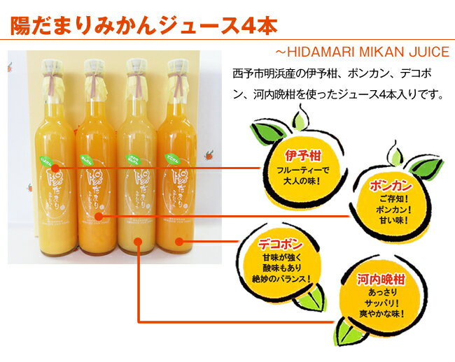 太陽の光をいっぱい浴びて育った晩柑類をそのまま搾った100%ストレート果汁西予市明浜産の伊予柑、ポンカン、河内晩柑、デコポンの4種類入です 陽だまりみかんジュース4本